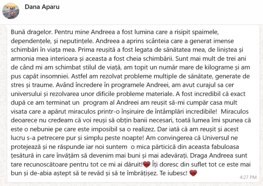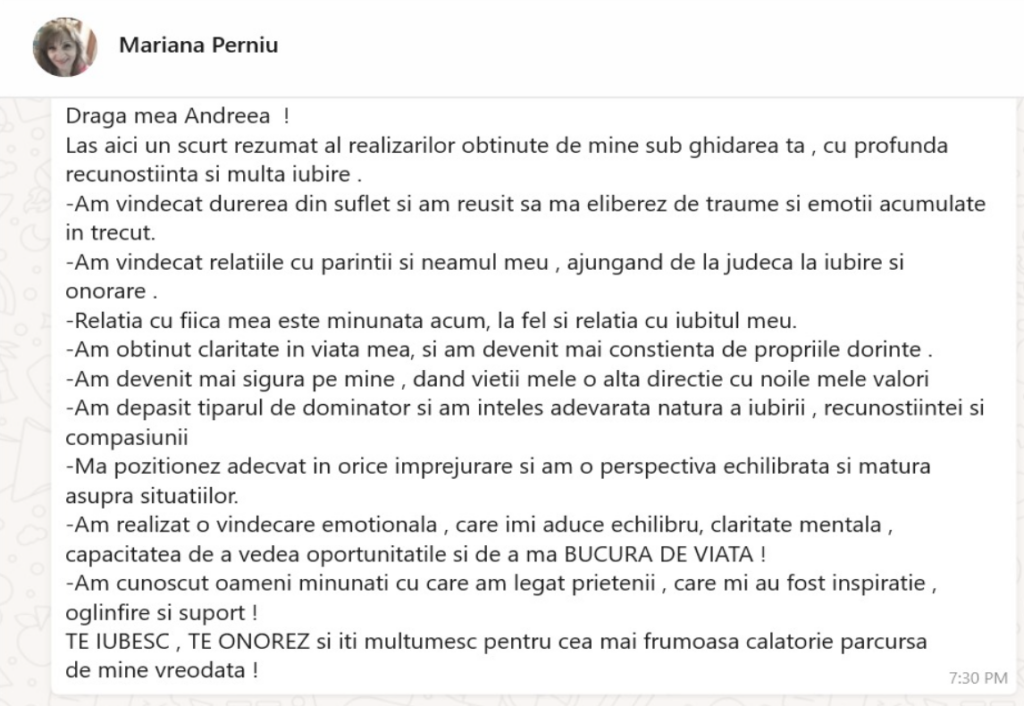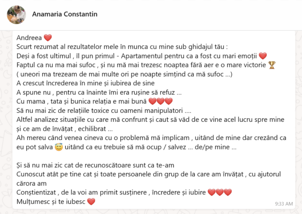 Rezultate reale: femei care nu mai adorm cu gândul că e ceva „greșit” cu ele. Femei care simt din nou bucurie, siguranță, claritate. Femei care, după ani de autosabotaj, și-au regăsit în sfârșit vocea.